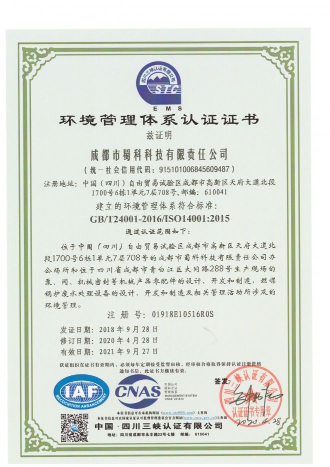 環(huán)境管理體系認證證書