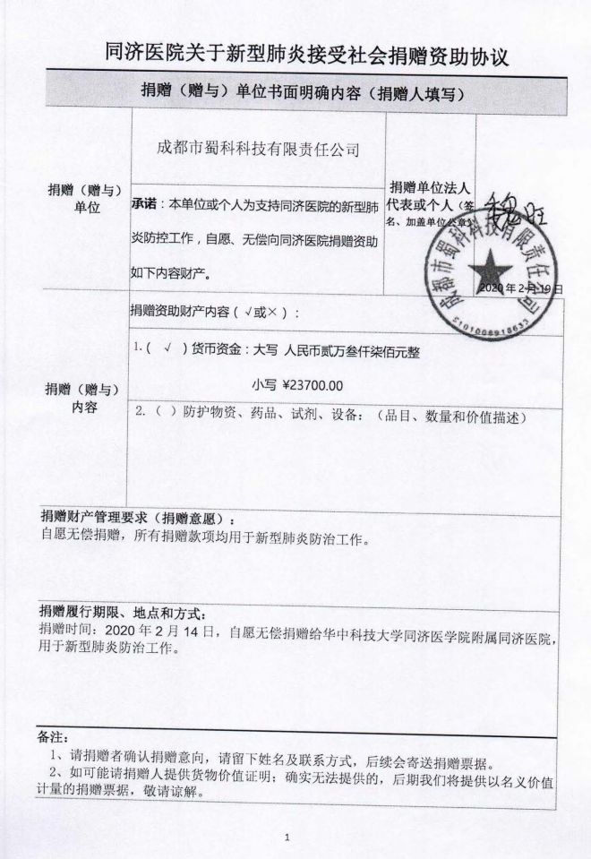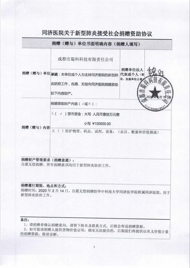 2月14日經(jīng)公司定向捐贈(zèng)給華中科技大學(xué)同濟(jì)醫(yī)院院附屬同濟(jì)醫(yī)院的公司捐款和公司員工的個(gè)人捐款已經(jīng)全部由同濟(jì)醫(yī)院接收,將全部用于支持新冠肺炎疫情防控工作。