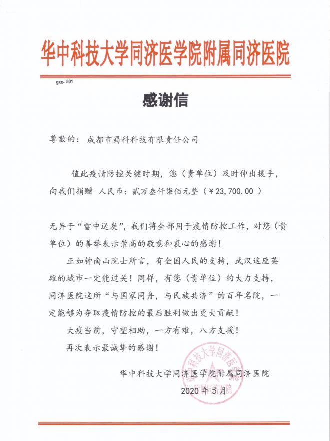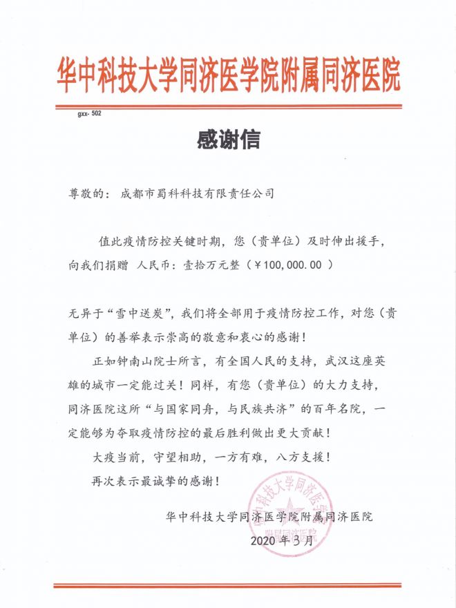 近日華中科技大學(xué)同濟(jì)醫(yī)學(xué)院附屬同濟(jì)醫(yī)院給蜀科公司寄來感謝信,感謝公司及員工在疫情防控期間的及時捐贈及關(guān)注。